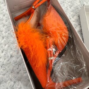 Neon Orange Feather Trim Convertible Heels. Wear them three different ways! 3.5 inch heel makes them manageable. Size 38 or 7