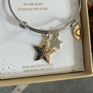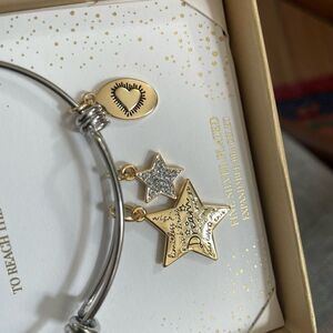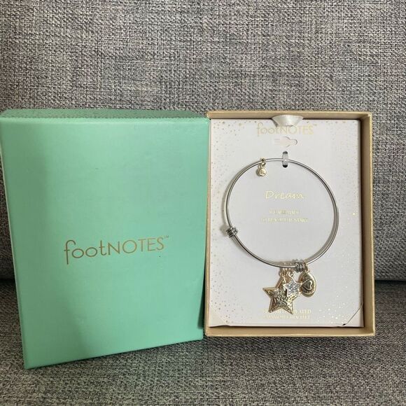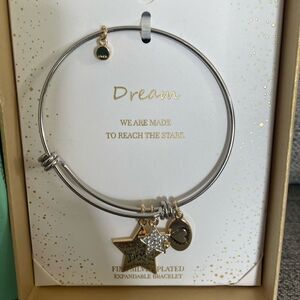 New inbox and perfect for giftgiving, footnotes dream bracelet in fine silver plate. Expandable style. Silver and gold tone with some rhinestone. Gorgeously boxed and printed with dream we are made to reach the stars. Four charms, including one solitaire, rhinestone, one heart, rhinestone star, and one star etched with words of encouragement like dream, inspire, you got this, Fearless, hopes, limitless, possibilities, and wish.