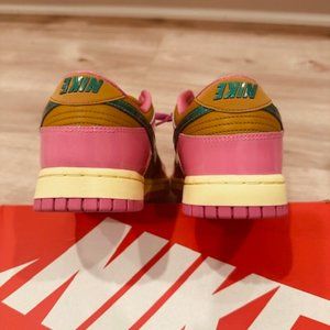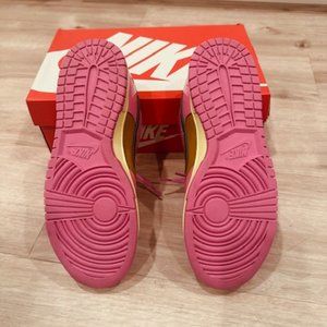 The shoe has a low top design and a playful pink colorway. The upper is made of high-quality leather. Shoes are brand new in box. I accidentally ordered the wrong size and can not return or exchange. It's a limited release model, so grab yours now and add it to your Nike Dunk collection.