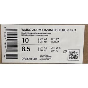 NIB Nike | ZoomX Invincible Run FK 3 Running Shoes | Black/Maroon | Size 10W