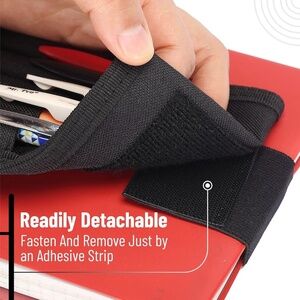 Keep your pens, pencils, earphones, cords/ cables, or glasses handy with with this adjustable notebook holder! Fits to all size notebooks and cover thicknesses. Brand new in box.... purchased multiple versions and missed the return window on this one.
