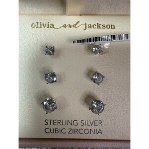 The NIB Olivia And Jackson Sterling Silver Cubic Zirconia Studs 3 Earrings Set features a classic and elegant design perfect for everyday wear. The earrings are made of high-quality sterling silver with a beautiful white/colorless cubic zirconia stone set in a secure prong setting. The butterfly closure ensures a comfortable and secure fit on the lobe. Ideal for those looking for a stylish and versatile accessory to add to their collection, these earrings are a great addition to any jewelry collection.
