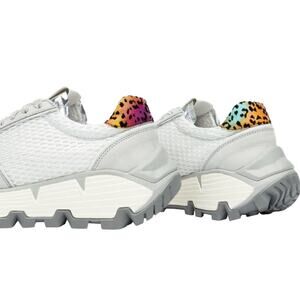 A minimalist take on the retro-gone-contemporary runner. This sneaker features a spectrum of flocked rainbow leopard-printed leather on the heel tab. A vivid moment.