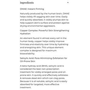 DMAE: Firms & lifts sagging skin instantly & over time. Visibly plumps skin to support skin surface & protect against drying environmental aggressors.