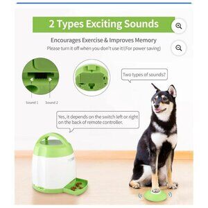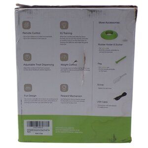 Contains remote control, will produce an exciting sound when pet fulfills their fun task. Adjustable treat dispensing, rubber holder & sucker, peg, scoop, and USB cable. Promotes IQ training, weight control and positive reward mechanism.