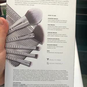 Brand new in box. Never used. Set comes with a powder brush, fan brush, crease brush, concealer brush, eyeshadow brush and an adorable bag.