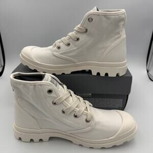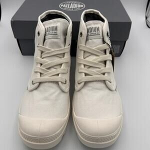 Brand new in box, these Palladium Pampa Hi combat boots in all-white bring a sleek, modern edge to any outfit. Known for their rugged durability and lightweight comfort, Palladium boots are perfect for urban adventures, outdoor treks, and streetwear styling.