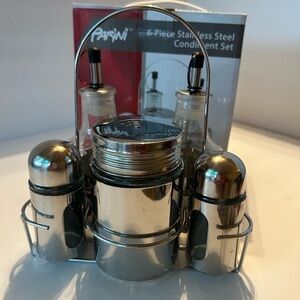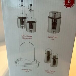 New in Box Parini 6 piece condiment set. Combination of glass and stainless steel. Salt & pepper shakers, vinegar & oil dispensers, spice/herb Jar. Cute stainless steel rack.