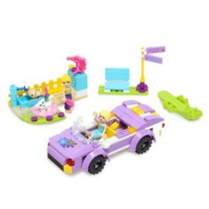Plastic building block set assembles a pet salon and vehicle