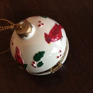 NIB Precious little red, green & gold cardinal with mistletoe Christmas porcelain round ornament. Sized to hold small treats or tiny treasures, tie it to presents, hang it on the tree, drop into a stocking or add to place setting on your holiday table. Has gold-tone metal trim and hinges (in Limoges style), with gold thread hanging loop. Each 3-4" high, 2-3" wide.