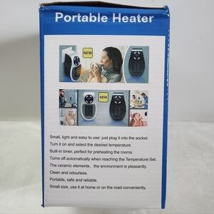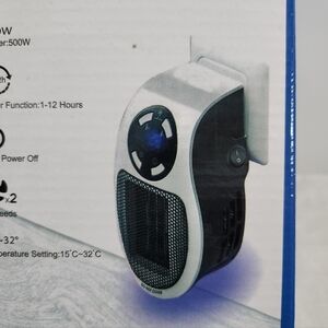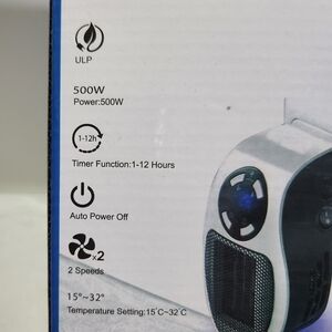 NIB Portable Plug In LED Heater. 500W, built-in timer function 1-12 hours, auto power off, 2 speeds, 15-32 C degrees setting, efficient power, thermal protection device, safe & reliable, PTC ceramic element, clean & odorless. Small size to use at home or on the road. Approximately measures 7" x 3.5" x 4". Comes with instructions. Brand new in box! Box damaged from storage but product is safe. 2 available!