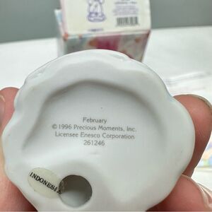 NIB Precious Moments February porcelain figurine. includes original box. figurine is of a girl holding a heart with a purple stone in it for February's birthstone the amethyst