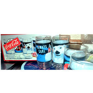 NIB- RARE & FUN! Set of 8 Polar Bear Coca-Cola Large Drinking Glasses in Box