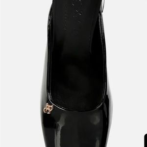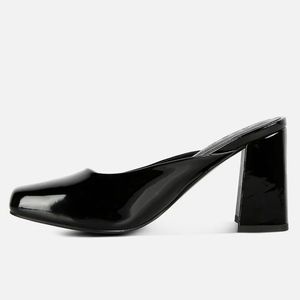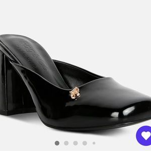 New Black Chunky Heeled Mules with square toe. Size 8. The gold “RC” shown in picture DOES NOT come on shoe, they are just very similar to a designer brand so it’s to keep it from being flagged! Rag & Co just shows it with Gold RC to prevent flagging. See last pic for deets!