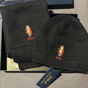 Stylish black hat and scarf set. Features iconic Ralph Lauren logo. Perfect for cold weather