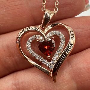 Verbiage taken from Redbee on Amazon to describe the necklace: “Gold Plated Necklace for Women: These necklaces have multi-layered 18k rose gold plating are different from those very thin layers of gold. This way can extend the appearance of this type of jewelry, so it can still function for a long time.” Beautiful CZ accent diamonds throughout! Says "Remember I love you Mom" around the heart. In the center is a red "garnet" cz heart diamond. I borrowed some stock photos from their website to help show you how it looks.