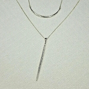 This gorgeous delicate necklace is a versatile piece that can be worn together or separately as individual necklaces. The pendant and arc shape silver pieces are beautifully hammered and have a shiny finish. Includes an 18" length and 33" length with a lobster clasp and 2" extender.