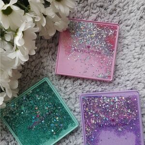 This is the I Heart Revolution Glitter Seeker eyeshadow palette trio. It features three palettes, each with nine glittery shades.