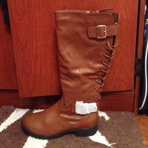 Brand new in the box. Size 8 riding boots and are NOT extended calves. They are brown and literally go with anything. They have a lace up theme in the back of the boot and a side zipper for closure. Please ask me any questions you may have. Thanks for looking!!