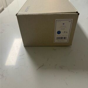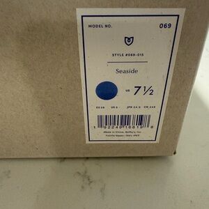 Rothy's shoe box label shown with Seaside color name and blue swatch. Clear brand marking and size indicator. Clean, minimal retail label visible.