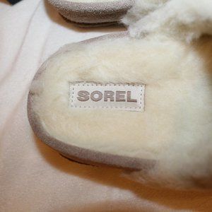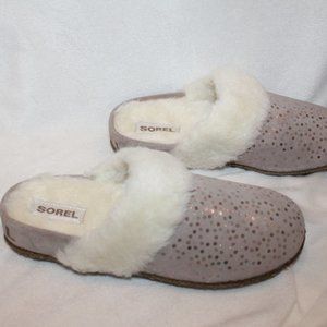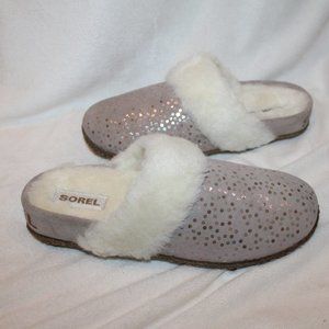 NIB SOREL METALLIC BEIGE TAN SLIP ON FUR LINED SLIPPERS YOUTH 6 FITS WOMEN'S 8