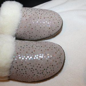 metallic finish, cozy lining, indoor and outdoor wear rounded toe, man made sole slide on leather and textile upper NEW IN BOX GUARANTEED AUTHENTIC THESE ARE YOUTH SIZED 6 WHICH FITS WOMEN'S SIZE 8. YOU WILL RECEIVE A YOUTH SIZED BOX AND SHOE.
