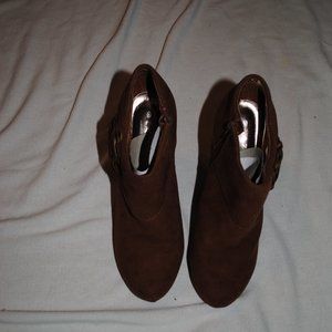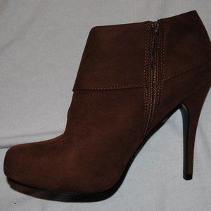 NIB SZ 10 BROWN FAUX SUEDE 5IN HEEL WOMEN'S BOOTY, 5IN INSIDE ZIPPER FOR EASY ON & OFF. FABRIC FLOWER DESIGN ON OUTSIDE ANKLE