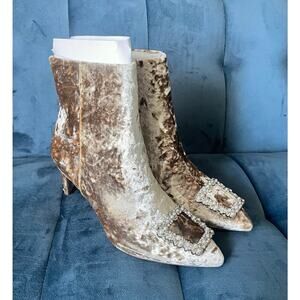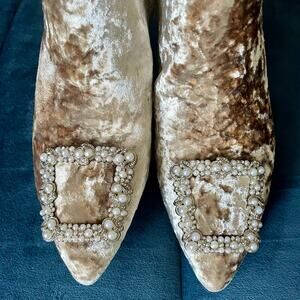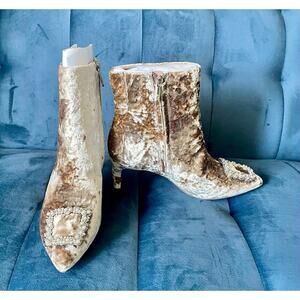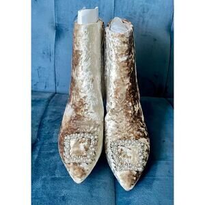 Sam Edelman "Ulissa" Velvet Boots in Prosecco - Sleek high heel velvet ankle boots with a rhinestone and pearl encrusted buckle on the vamp. Pointed-toe, zipper closure, back & zipper logo.