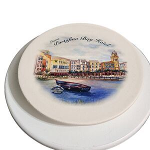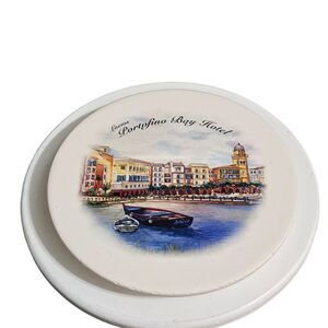 This is a set of four Sandstone Creations Portofino Bay Hotel Coasters. They are in great condition. They are made of sandstone and have rubber on the bottom to prevent sliding. The only possible flaw is on the edges of the coasters where there is minor pitting on the edges (this is normal). The coasters measure 4.5" in diameter and are 5/8" tall. These coasters come in the original box, although they have been used some. If you have any questions, message me.