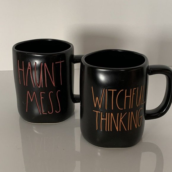 Great for Halloween or anytime of the year. Set of 2 Rae Dunn mugs. Etched "Witchful Thinking" & "Haunt Mess".