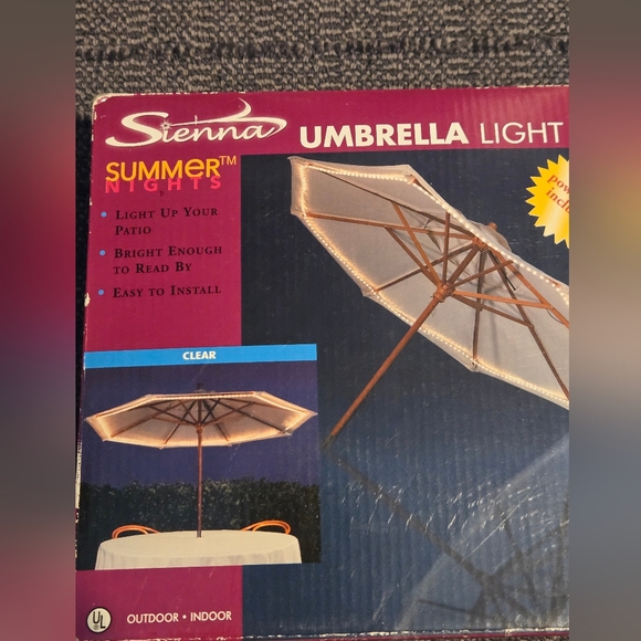 NIB Sienna Patio Umbrella Light Kit. Easy To Install And Has 18' Power Cord. Comes w ties for umbrella. Weather resistant. Illuminate your good times!