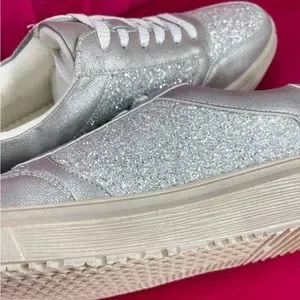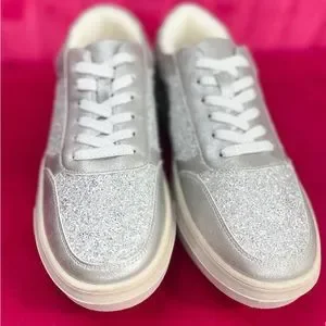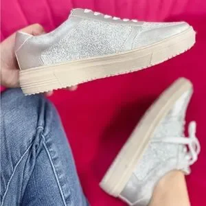 Step into adventure with these low top sneakers. Made with a silver metallic upper and silver glitter detail, you'll be stepping in style no matter where you go. The rubber sole and cushioned insole offer comfort and support, while the textured sole and lace up design keep you safe and secure. Challenge yourself to explore in comfort and class!