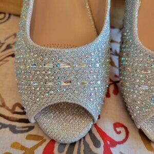 NIB Silver Rhinestone Peep-Toe Wedge Shoes Size 8.5