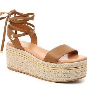 New in Box. Size 8.5 (fit true to size). Tan with woven and gold detailing. Tie up ankle detail.