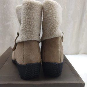 New in box size 8.5M Khombu Beige Moon Dance Low Leather Ankle Boots with Zip Closure and buckle accent. Fold over top with faux wool lining to keep feet warm. Textured sole. Boots have zippered closure. Boots are a size 9M, but the box is mislabeled as 8.5M.