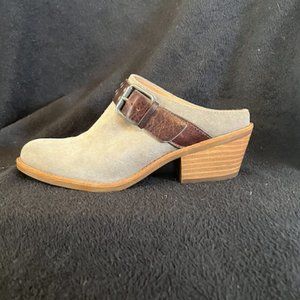 Taupe suede leather mules / clogs with wooden block heal and buckle.