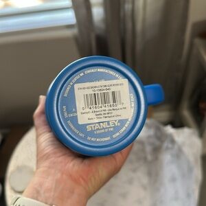 Vibrant blue Stanley tumbler with a red straw. Includes a sturdy handle and sleek design.