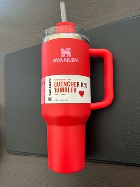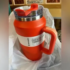 Insulated Stanley tumbler for all-day hydration. Sturdy handle for easy carrying. Secure lid for spill resistance. Bold orange finish with coral accent on the handle. new in the box with a straw