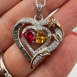 Beautiful heart pendant with tons of cz round cut diamonds throughout! There's a rose gold tone rose on the right side of the heart. The overall necklace might be 18k gold plated, based on some research I have been conducting, however I have no way of proving that. So, it's priced lower because I'm not certain.