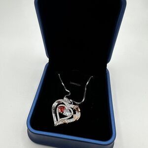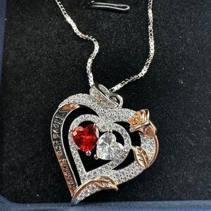 Beautiful heart pendant with tons of cz round cut diamonds throughout! There's a rose gold tone rose on the right side of the heart. The overall necklace might be 18k gold plated, based on some research I have been conducting, however I have no way of proving that. So, it's priced lower because I'm not certain.