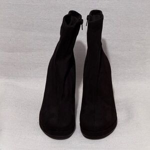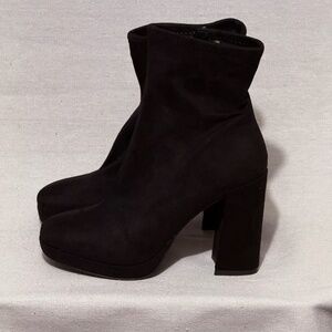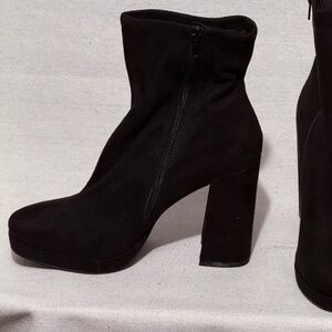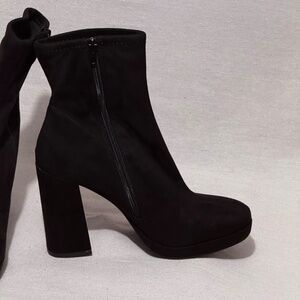 New in box Steve Madden Macayla Block Heel Boots in black. Add bold style to your wardrobe with these Steve Madden Macayla boots. Designed with a sleek black fabric upper and modern block heel, these boots are versatile enough for casual or dressy outfits. Heel Height: ~4 in (block heel). Shaft Height: ~8 in. A suede-like feel to them. Side zippers. Size 9.5.