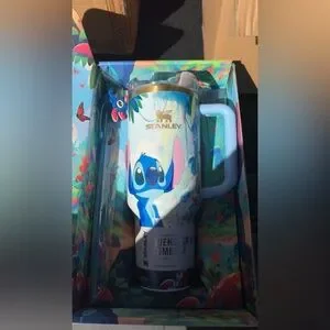 Fun Lilo & Stitch design with bright character art. Light blue handle and pastel blue body. Durable insulated steel keeps drinks at temperature. Colorful pink accents add a playful touch.