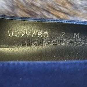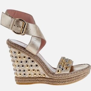 A favorite of Kate Middleton! The Stuart Weitzman Corkswoon wedge has a heel of approximately 4.5 inches, a 1.25-inch platform and a rubber sole. They are made in Spain and crafted out of blue suede and a leather footbed.