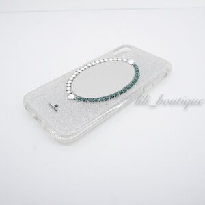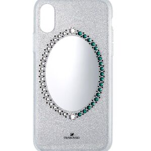 Get noticed with this on-trend mirror smartphone case inspired by Swarovski's Black Baroque jewelry line. Ideal for checking your makeup on the move or taking the perfect selfie, this fancy design features a large mirror in a silver glitter background, reflecting both your nice (clear crystals) or naughty (green crystals) sides. The phone case is compatible with the iPhone X/XS