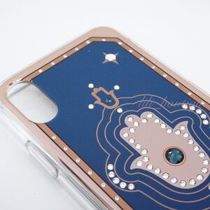 Opt for a luxury look with bohemian edge with this unique smartphone case for the iPhone X/XS. This stunning case features a protective hamsa hand motif as its centerpiece, and is embellished with a mix of blue and clear crystals, metallic prints, and a rose-gold tone plated mirror finish