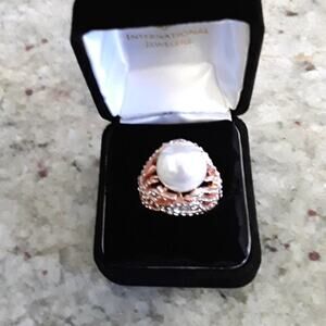 NIB Sz 6 Rose Gold Diamond Rhinestone & Pearl Cocktail Statement Ring