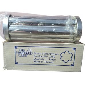 The Pampered Chef Valtrompia Bread Tube Flower #1550 is a new in box loaf pan designed in the shape of a flower. This silver-colored pan features a convenient lid and is easy to clean, making it a great addition to any kitchen for baking homemade bread and more. With the trusted Pampered Chef brand and specific model number, this bread tube flower is sure to enhance your baking experience with its unique and stylish design.
