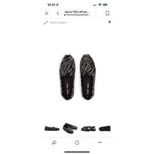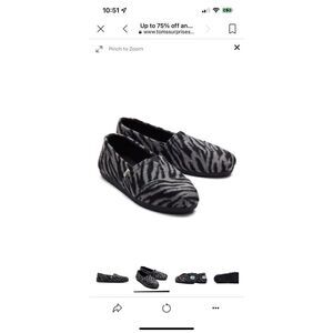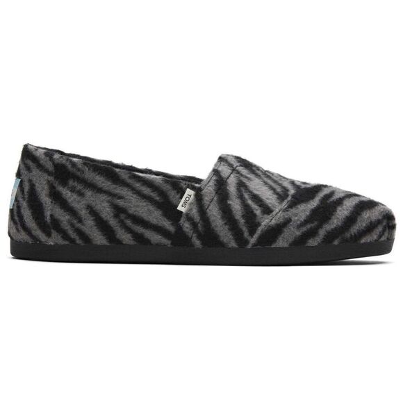 NIB TOMS Alpargata Zebra Black Gray Slip On Casual Flats Shoes Sz 9. Canvas footbed. Elastic gore for easy on/off. OrthoLite Eco LT insole. Textured fleece upper fabric. TOMS signature CloudBound™ Soles for extra comfort, breathability and traction. Rubber outsole for traction. Item in excellent condition. No known rips, tears, holes, stains or defects. First quality item.