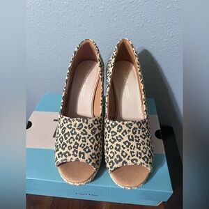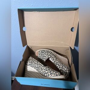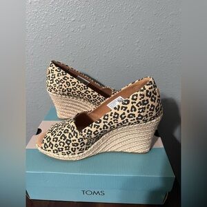 NIB TOMS Leopard Espadrille Peep Toe Wedges Women’s Sz 7 US NEW In BOX 3.5 Heel