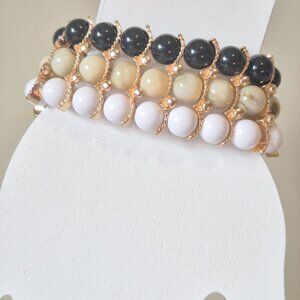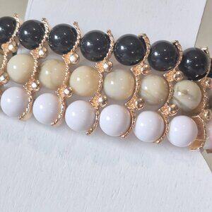 This new stretch bracelet features bold black, tan, white, and gold-tone beads in a one-inch wide design.